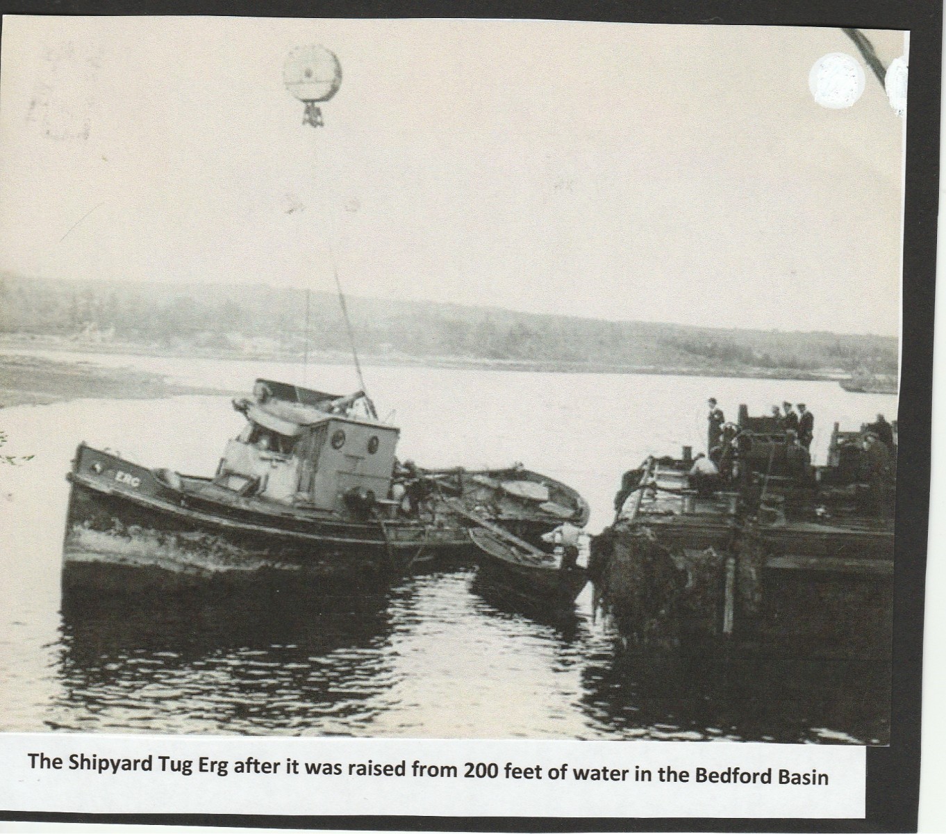The Erg was then equipped with air compressors and electrical generators to support welding and pneumatic tools. During the Second World War the vessel played a very important role in assisting with the movement and repair of larger ships. The Shipyard workers on the tug consisted of electricians, carpenters, iron workers and other tradesmen. Activity on the Halifax Harbour and the Bedford Basin were extremely busy at that time with ships going to and from the port at all hours, so it was not surprising that many accidents happened on the water surface.