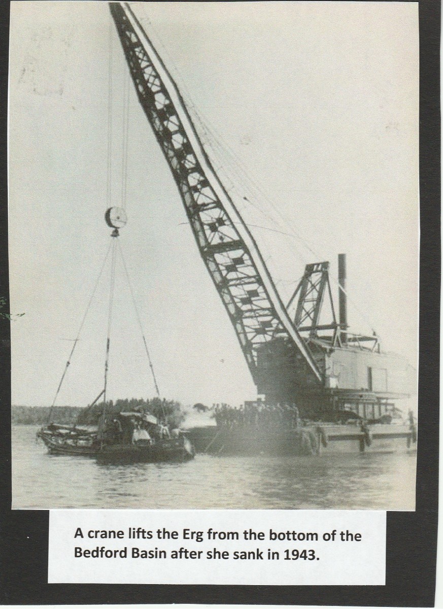 On the foggy, rainy morning of July 6, 1943 at 9 o’clock, the Erg carrying workers and equipment, was on its way to service a Merchant Marine Ship, anchored in the Bedford Basin with an assembled convoy, when it was hit by a Norwegian freighter called the Norelg, a larger ship weighting in at 3,382 tonne. The Erg was struck from behind and didn’t stand a change when the big freighter with her steel sides towering high above, crumbled the little tug on the port side and completely tipped her over, sinking her within six minutes. The accident happened in 75 metres of water in the central area of the Bedford Basin. There were twenty-four men aboard and only five survived, a few were able to escape through the only exit door leading from the wheelhouse and the other nineteen men were trapped in the wheelhouse and the engine room below the deck and because of the speed in which the vessel sank, many did not have time to escape and drowned. Stories were told by survivors of heroic attempts by men who were struggling to stay afloat themselves in the rain swept water, while attempting to save others.