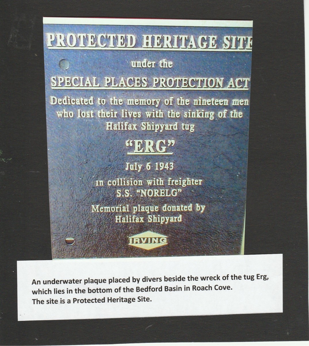 The Halifax Shipyard later presented a bronze plaque during a ceremony to honour lost workers. The Erg hull was too badly damaged to repair, so the tug was taken to shallow end of the basin in Roach Cove, north of the magazine and there she was scuttled and sunk for the third and last time on August 24, 1943.