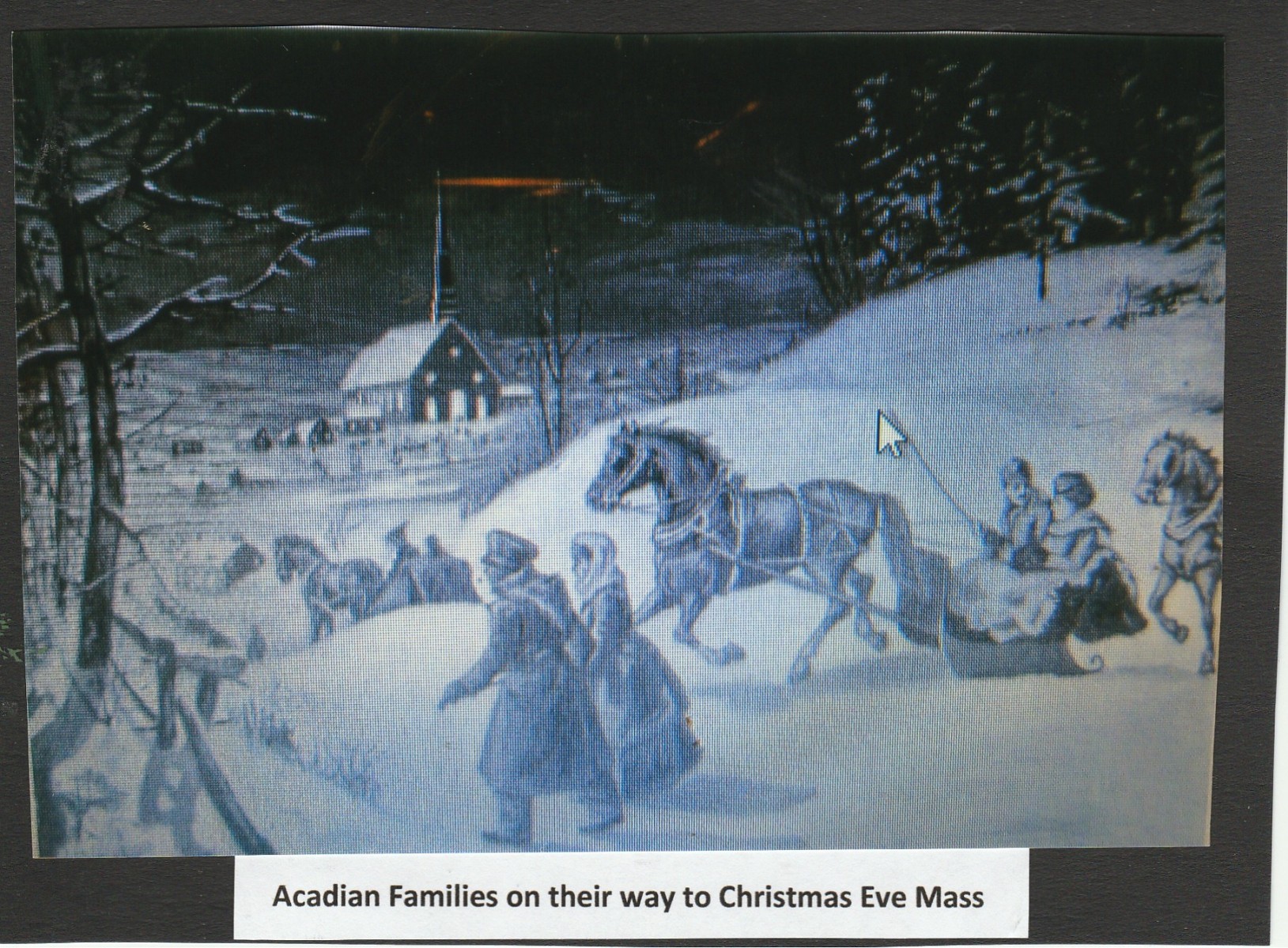Christmas was an exciting time for her, although most French Acadian had large families, she was the only child, born to Nathalie (Deon) Broussard and Charles Broussard, her cousin Bertha along with Bertha’s father moved in with her family when she was in her teens, and she became her best friend. Attending mid-night Christmas Eve mass at St. Croix Church in Pomquet, with all her family and friends was one of the highlights of the holidays. The family travelled to the church by horse and sled, hardly feeling the cold air as they were covered by buffalo furs, making them warm and cozy. As the sled glided through the snow on this special night, the tingling of the bells on the horse’s harness echoed in the crisp air.