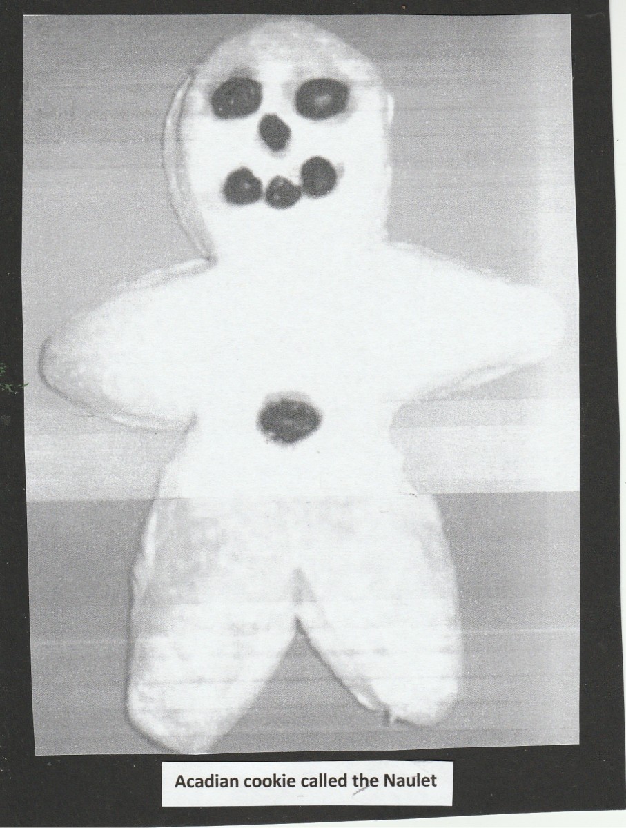 Acadian children especially enjoyed a particular treat called a Naulet, which was a large biscuit shaped like a little man, made from bread or cookie dough and decorated with raisins. My cousin Colleen Doiron said that they still bake the Naulet biscuit during the Christmas season in Pomquet, but in her family, candies are substituted for raisins and cookie dough for bread dough.