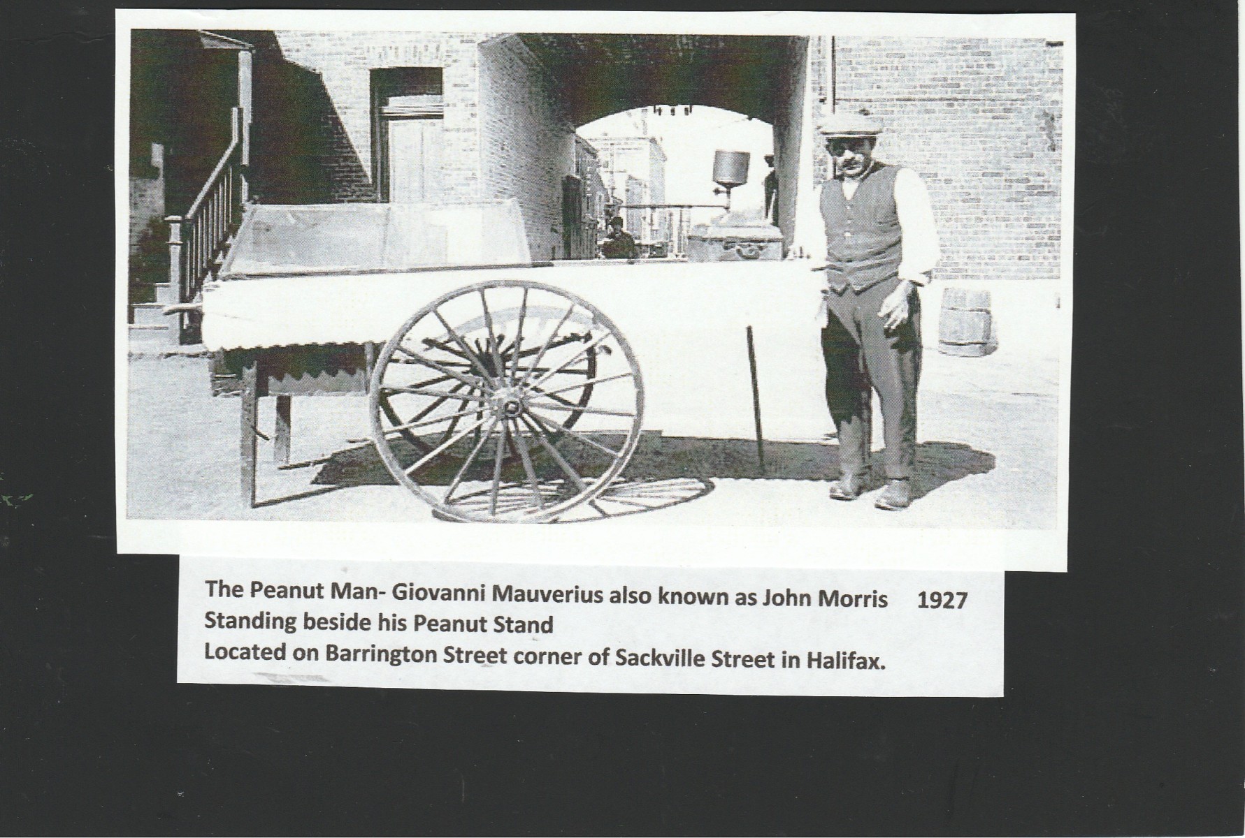 The Peanut Man had his wagon parked regularly on the corner of Barrington Street and Sackville Street for 28 years. By day he was seen standing at his Peanut Chariot, by night his wagon was lit by a flaming torch and its flare could be seen from a far. Because of his jolly and kind disposition he made many friends in Halifax over the years, especially the little children that often visited his peanut stand.