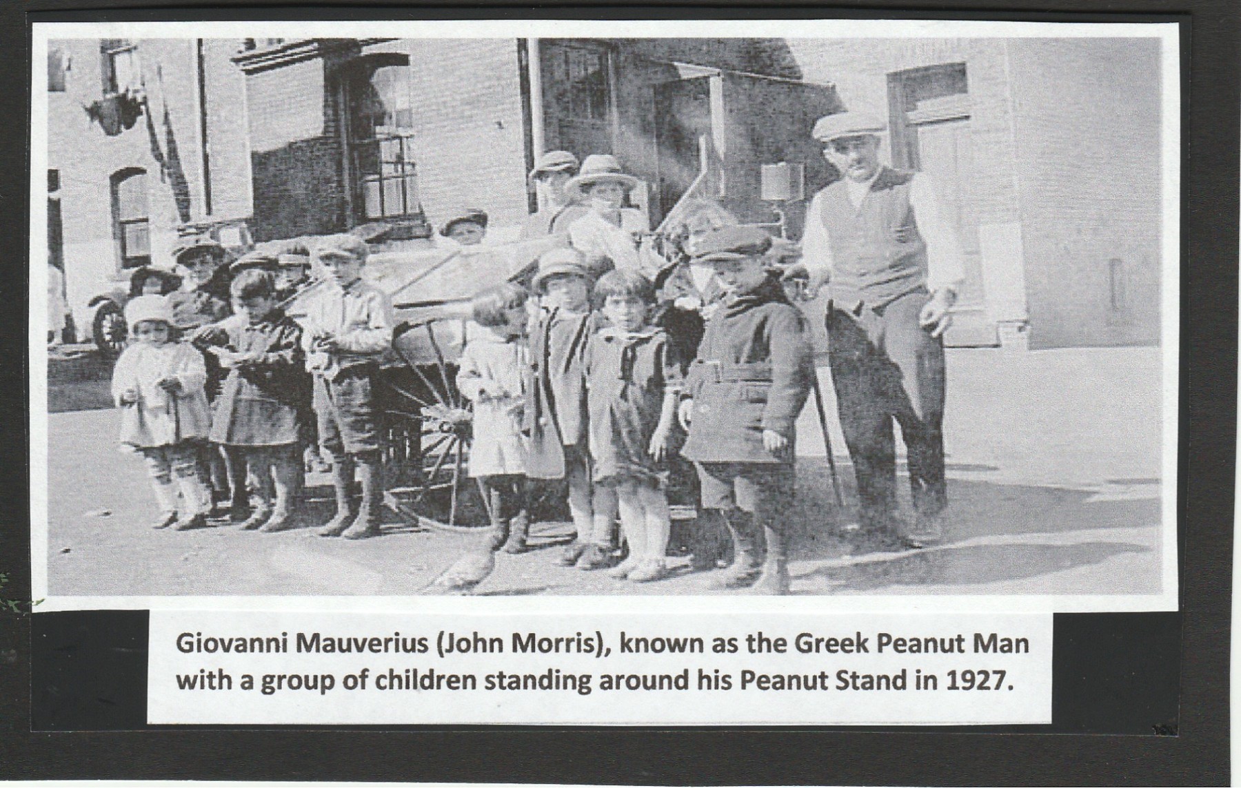 Finally John arrived in Halifax, Nova Scotia in 1909. He noticed immediately that the city of Halifax had no ‘peanut stands’ and an idea formed in his mind about starting a peanut business. He swiftly got to work, first ordering a peanut stand that cost him twenty dollars, which was a goodly sum in those days. His new little wagon was equipped with a copper box and a can of gasoline for keeping the peanuts hot. Later a glass case was added to cover the peanuts which not only kept the dust from the street off the peanuts, but it also kept peoples fingers from trying to sample his goods. Oil cloth was tacked all around the frame work for ornamentation. The wagon had two wheels on it and tiny little handles to push it. Two wooden legs on the wagon supported the end of the case.
