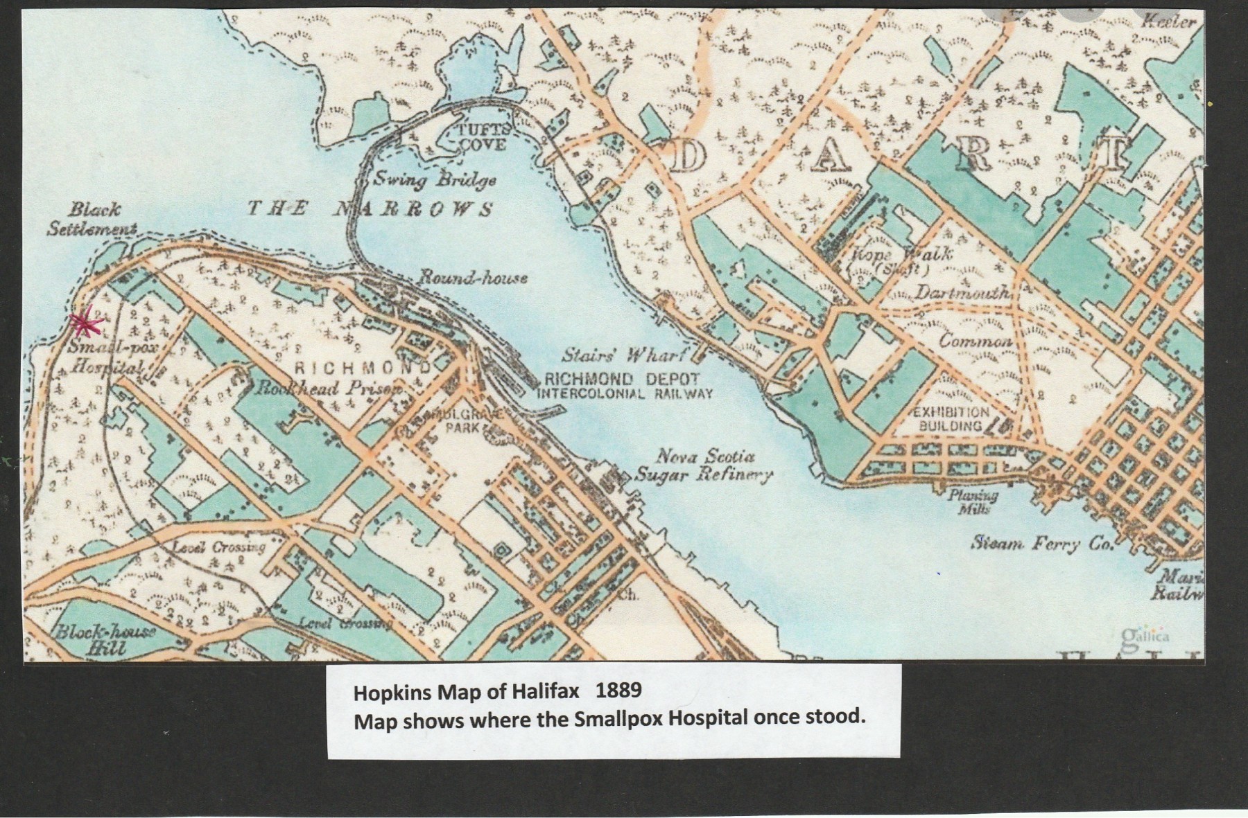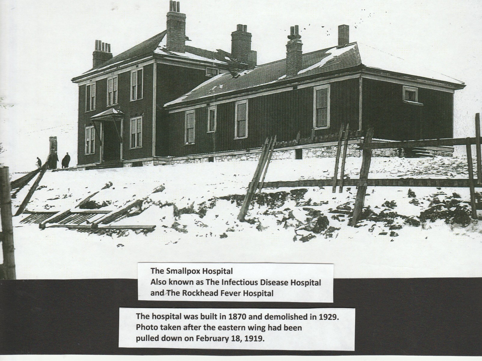 In 1870, a small hospital was built by E.H. Keating about 350 yards (325 metres) to the west of Rockhead Prison in the north end of Halifax. It was situated on the north- slope, close to the shores of the Bedford Basin and near Africville. It was first called The Smallpox Hospital, but it was also known as The Infectious Disease Hospital, then as The Rockhead Fever Hospital. The original building was a small wooden structure but two wings were added in later years. In April 1869, a number of patients with typhoid fever were transferred from the City and Provincial Hospital (V.G. Hospital) to the Infectious Disease Hospital, which was in the course of completion, but not yet finished. The hospital was originally built to accommodate smallpox patients, but soon the hospital was accepting patients suffering from other infectious diseases. It was used for coping with Scarlet Fever in 1893 and later it was used for general cases of infectious and contagious diseases. In 1915, the Health Officer filed a report warning against the unsuitability of the building’s use for controlling infectious disease.