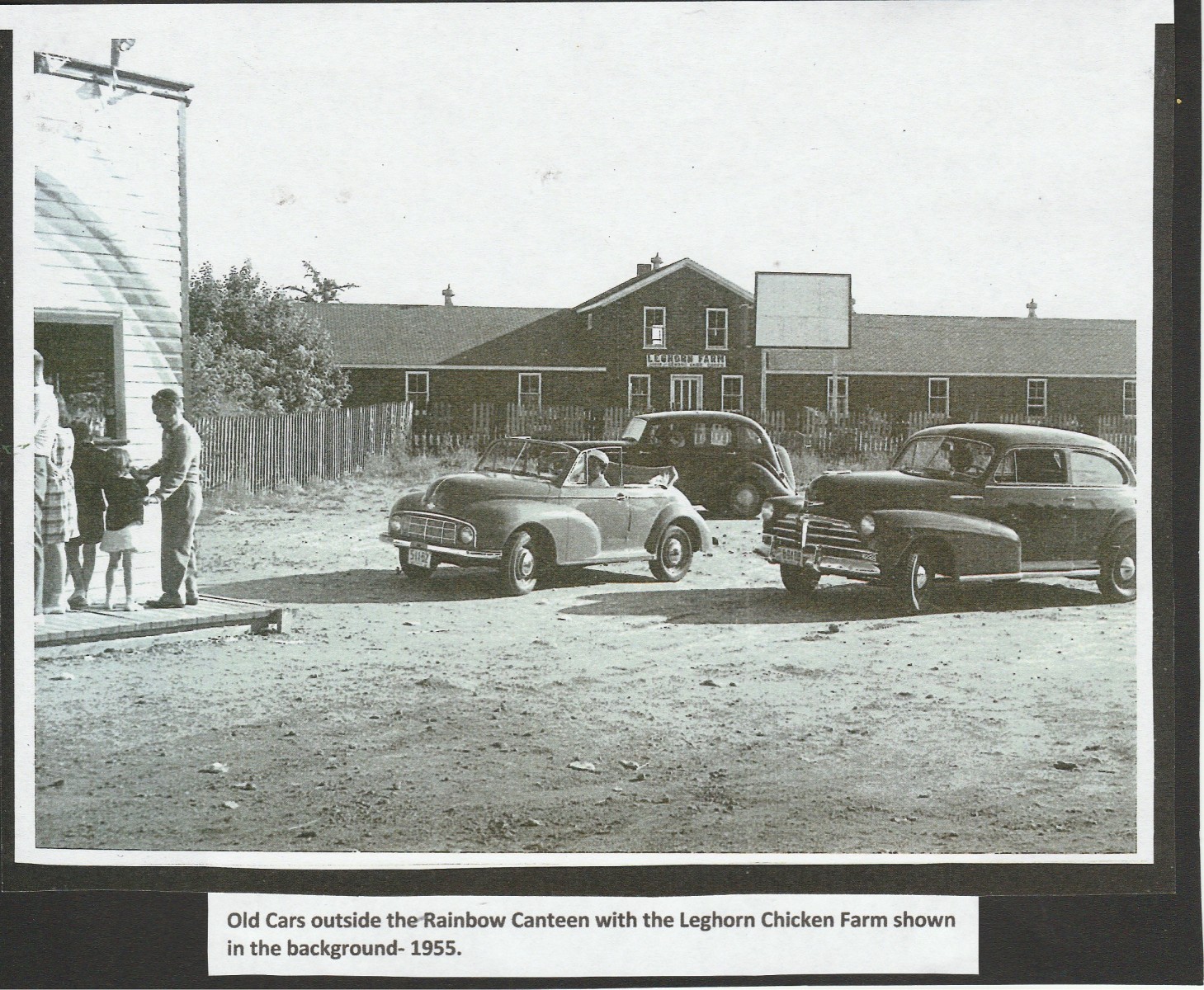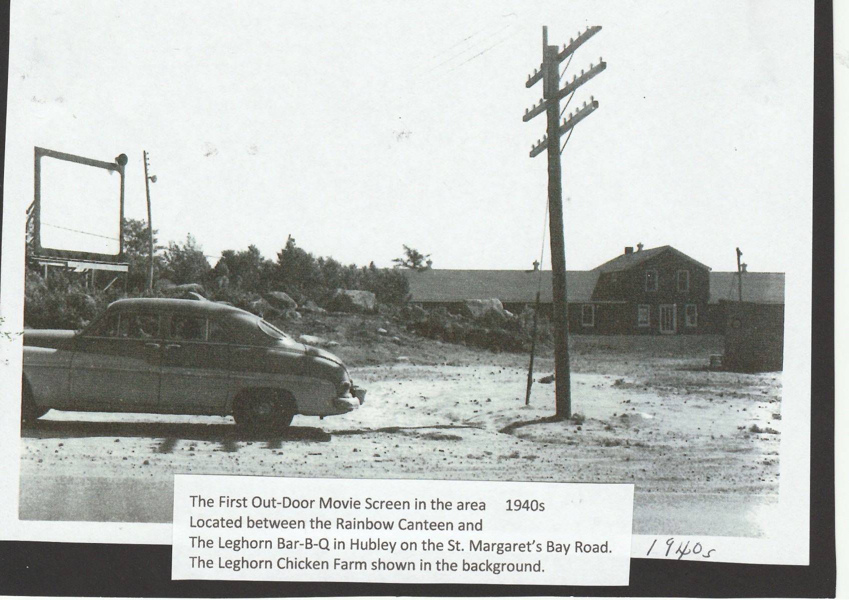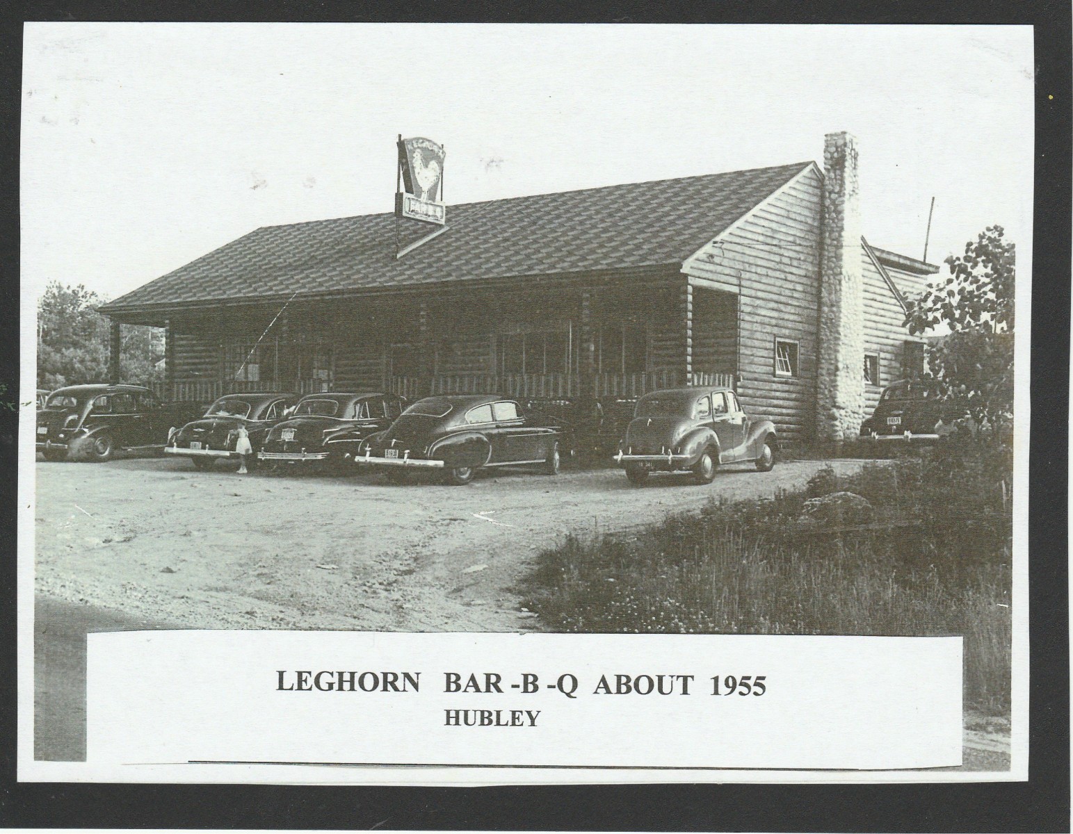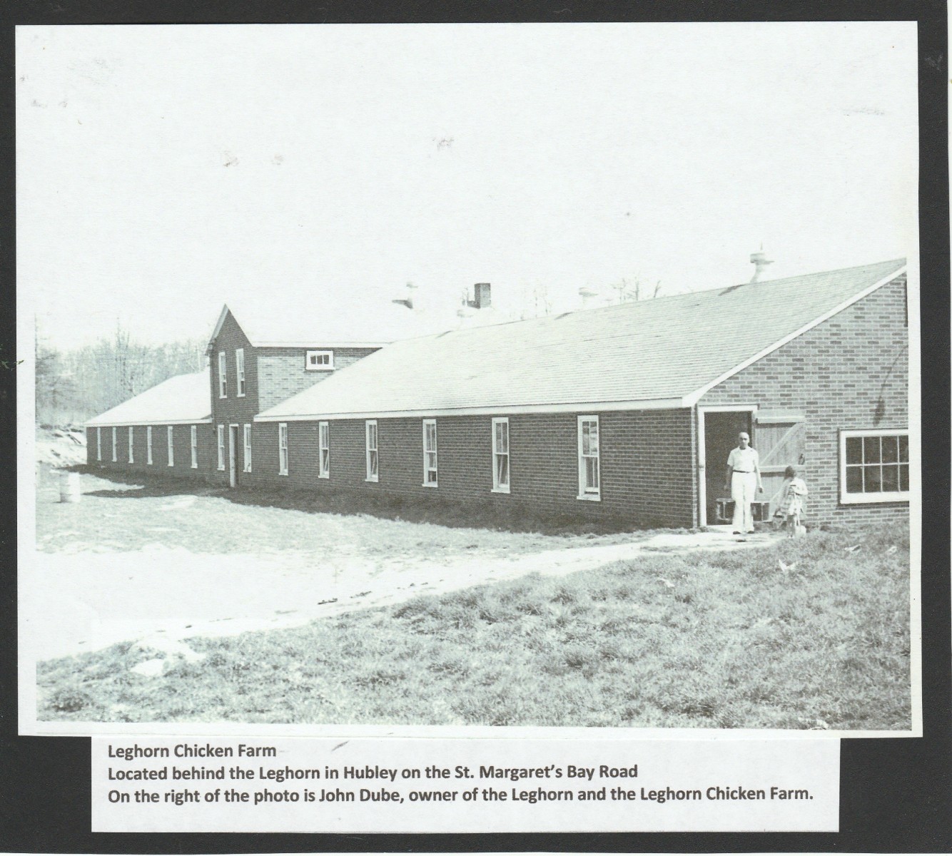 A large chicken farm stood in back of the establishment which supplied the restaurant with its chicken suppers. The first owner of the Leghorn and chicken farm was John Dube, who also had a take-out canteen called the Rainbow canteen next door to the Leghorn. Also located on the property, was a large out-door screen which provided movie entertainment, said to be the first out-door movie screen in the area before the Bay Road Drive-In. A good time was always had by the patrons who danced the night away to great band music not to mention the wonderful chicken dinners they served. The menu was simple, chicken only! It was also a place where you brought your own liquor, but of course hidden under the table. In the earlier years, Art Doucette and his band played there. Inside the building a grand old jukebox stood against one wall and was used during the bands intermission, another memorable feature was the beautiful beach stone fireplace which occupied another wall.