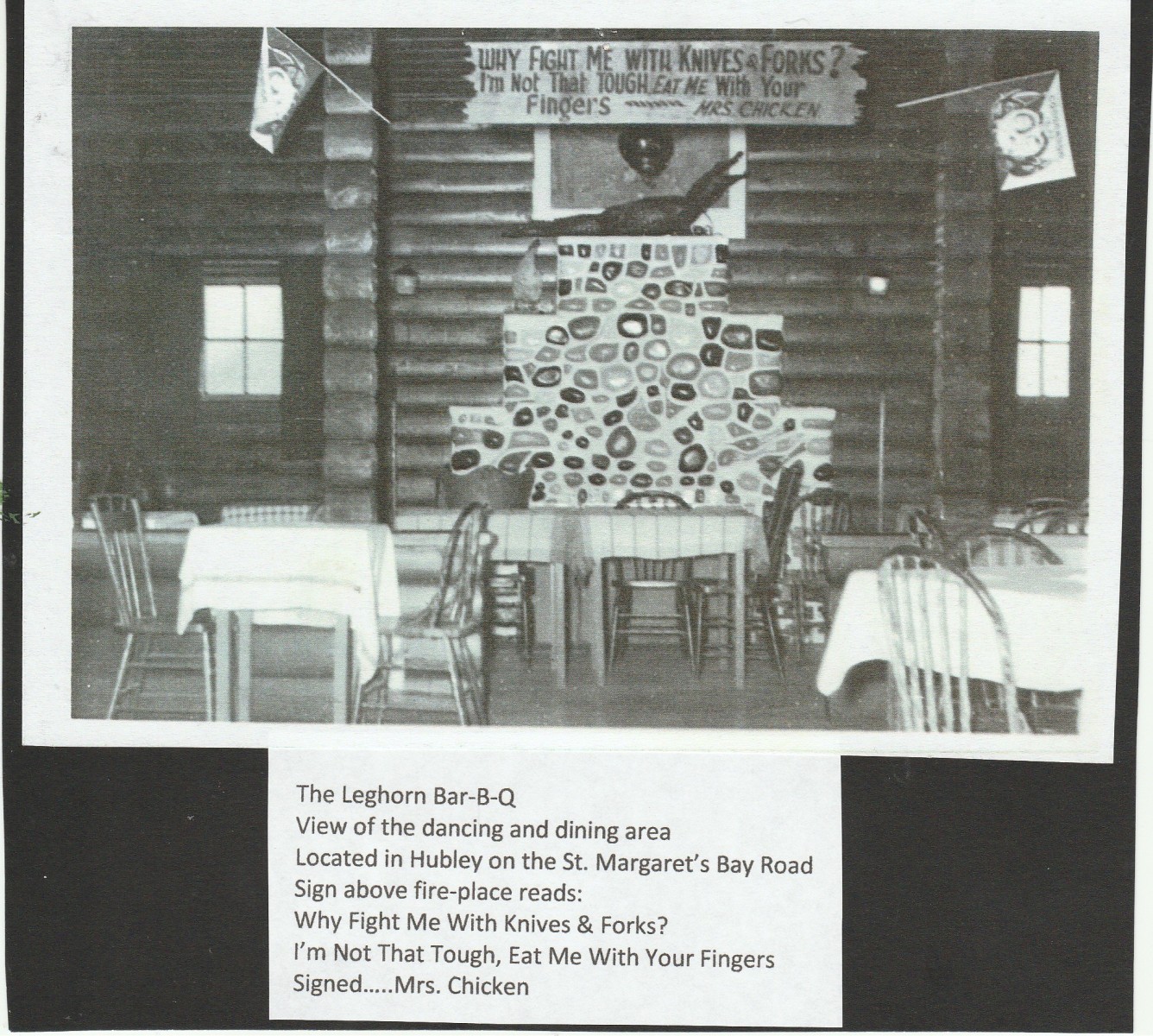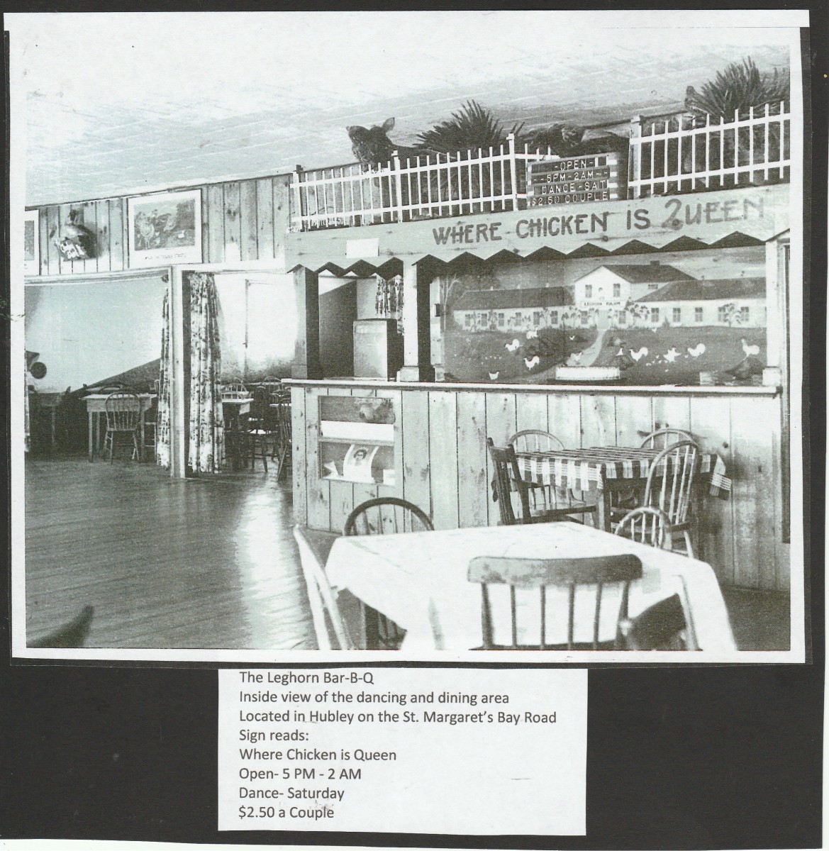 The Leghorn restaurant and dance hall opened in the 1950s, it was a very popular dance and eating establishment known for its great entertainment and delicious chicken dinners. It was also located on St. Margaret’s Bay Road in Five Island Lake, Hubley, 12 miles outside Halifax. Today the location where the building once stood is across the street from Bird Song Lane in Foxwood Village subdivision.
