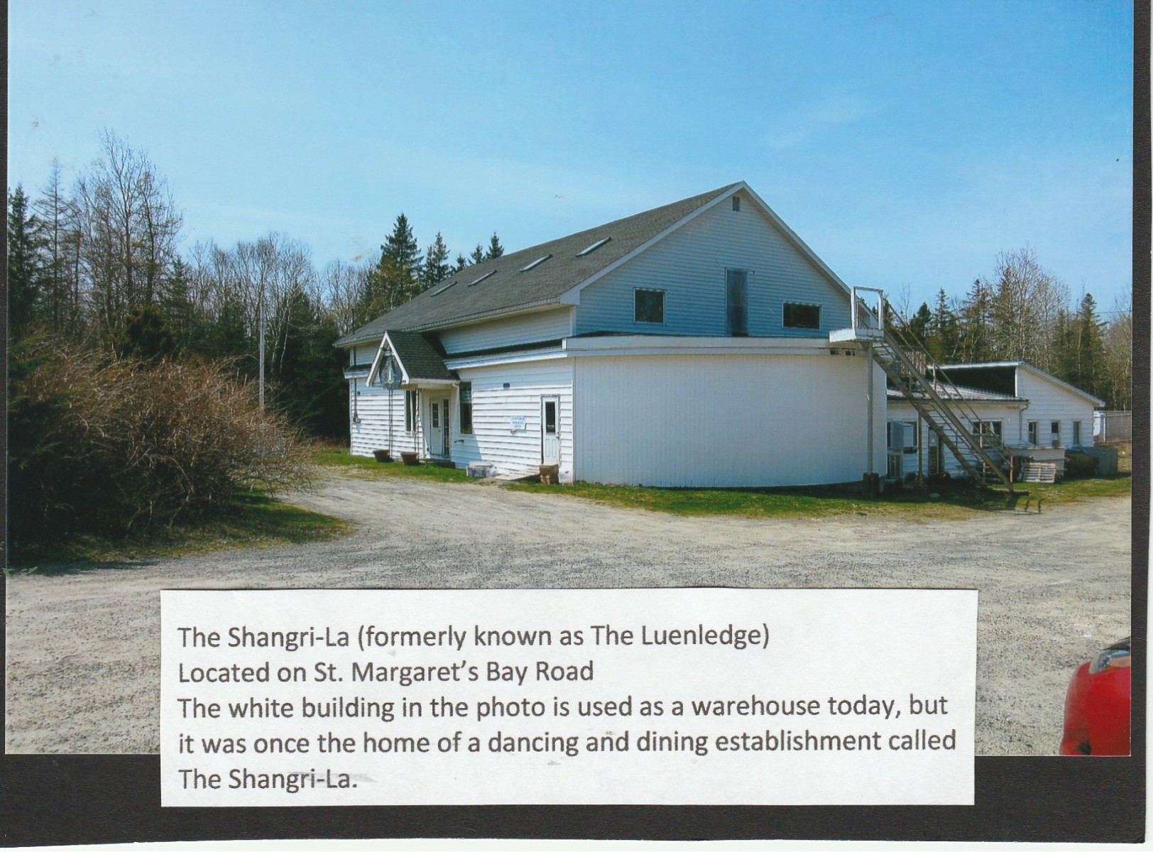 The Shangri-La was a high-end dancing and dining establishment that was located on St. Margaret’s Bay Road in what is considered Upper Tantallon today. The building is still standing across from Tantallon Woods. Jack Campbell purchased the structure and added a second storey, he then used it as a warehouse. His son John now owns the property, he also owns the Sou’ Wester Restaurant at Peggy’s Cove. John said that the white building, formerly known as the Shangri-La still looks pretty much the same inside. The raised stage is still there. John’s father Jack also owned the Lobster Pound in Peggy’s Cove and when he took a door from the old Shangri-La building to be used in his Lobster Pound, he noticed that on the other side of the door the word “Shangri-La” was written on it.