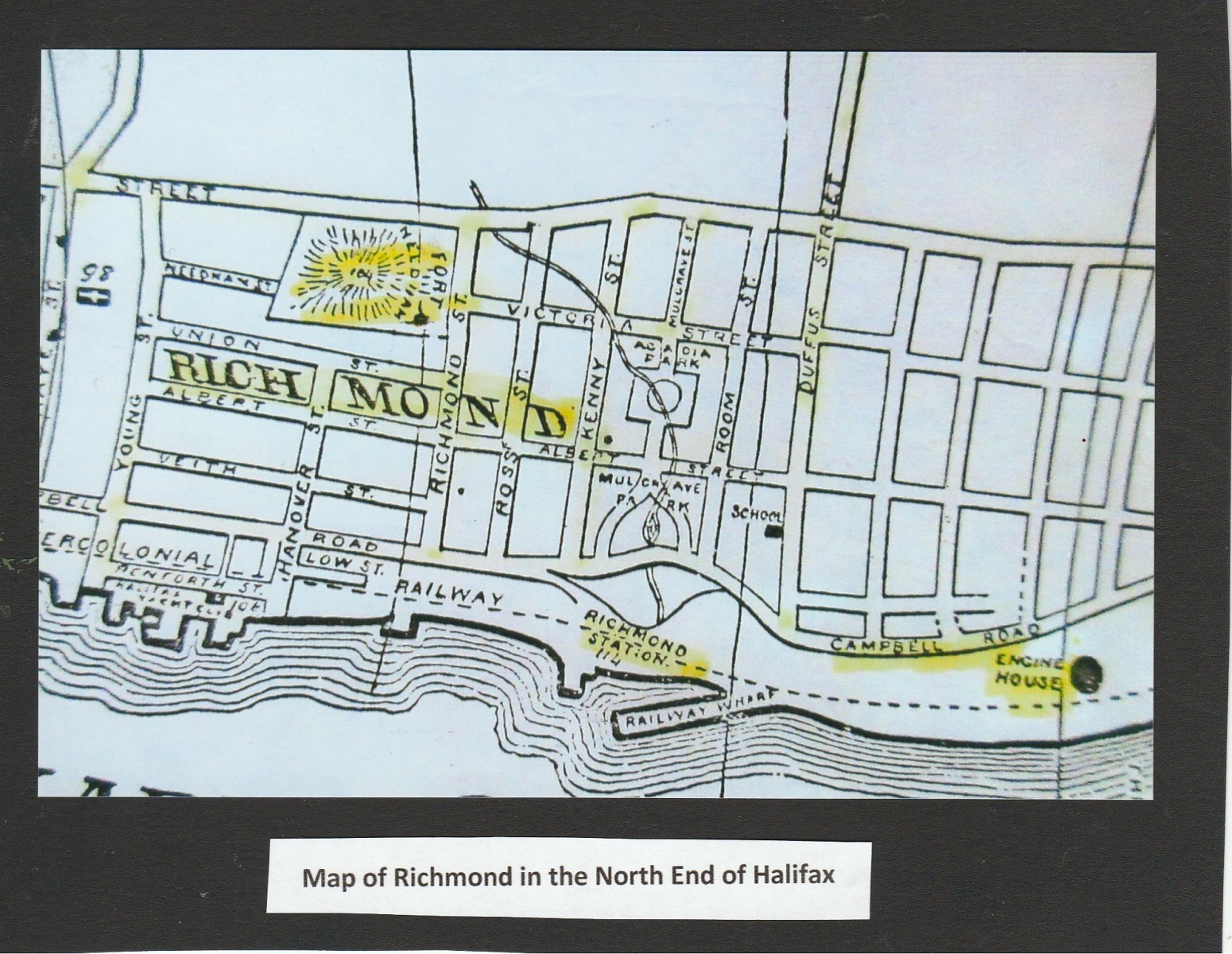 Richmond in the North End of Halifax probably got its name from the Gun and Company Milling Plant, who imported large amounts of grain from Richmond, Virginia. Richmond was a suburb located between Duffus Street and Young Street, on the slopes of Needham Hill. Richmond Terminals, originally called the Richmond Yards, are located along the waterfront at the foot of Duffus Street.