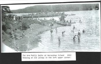 A new Public Bathing House opened at Horseshoe Island in 1927 which was vastly superior to the old bathing house. Bathing towels and suits were available at a small price. Concrete steps led from the road down to the bathing area which made it easier for people to descend