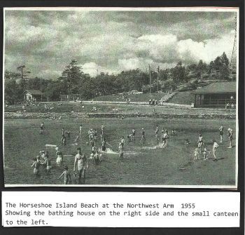 A small canteen stood on the hill just off the driveway leading from Quinpool Road. In 1936 a house-boat or shack which was built on a small scow was towed around the Arm and used as a floating canteen, but by 1938 it was a menace and abandoned on the Arm waters. It was then described in a Halifax newspaper as a potential danger to children, a menace to navigation and a despoliation to the beauties of the Arm. At that point it was resting on the beach just above the Public Baths and residents were worried that children may push it off and use it as diving raft.