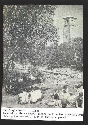 Located in Fleming Park on the Northwest Arm was another favorite bathing beach. The beach was surrounded by lovely rolling hills with many trees that supplied needed relief from the hot sun. Not far from the sandy beach a brook snaked down the hill into the sea water, all the while making a lovely laughing sound. Hundreds of people flocked there daily for fun in the sun. They also had a popular canteen in the 1930s and one was still there well into the 1960s. They also had a Public Bath Changing House that was close to the canteen. The Dingle Tower stood