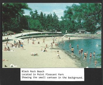 Enormous crowds flocked to the popular swimming beach every day when the weather was suitable. In 1927 they were said to have as many as 2000 people on a daily basis. It was beautiful with green grass surrounding the area where swimmers could lay on their blankets and soak up the sun after a refreshing swim. A stone wall formed a circle around the beach with a few concrete steps leading into the water and a wooden diving raft floated near the shore. A large Bath house was located there with changing rooms for 50 men on one side and rooms for 50 women on the other side.