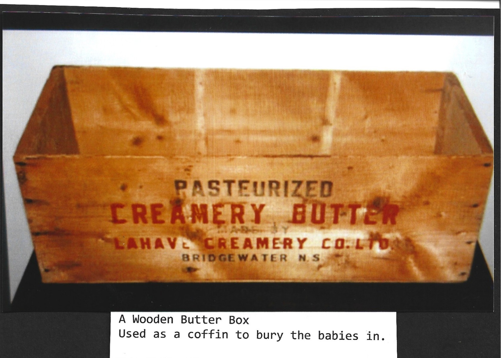 Any new born enfant that displayed illness or deformity of any kind were considered unadoptable and were of no financial gain to the Youngs so they were executed. These little tykes were fed a diet of water and molasses until they slowly starved to death, which took about two weeks. When death occurred they were placed in wooden pine butter boxes obtained from the LaHave Creamery Co. Ltd. in Bridgewater, NS. These enfants became known as “The Butter Box Babies”. These boxes became the newborns coffins and no identification was ever put on them. They were secretly buried in back of the Ideal Maternity Home and in the bushes behind The Seventh-Day Adventist Cemetery in Fox Point, property once owned by Lila’s family. Some were thrown into the sea and others were thrown into the Home’s furnace; casted away as if they were just household trash. It was whispered in the community that as many as between 400 to 600 babies died in the Home. There are no records left to confirm how many babies were born and died there, because fire in 1962 destroyed everything. There were no accurate records kept of births and deaths at the Home anyway. Some pregnant women in the Home were suspicious of the Young’s wrongdoing, but were afraid to voice them because Lila’s retaliation would be harmful to them, while others kept silent about the newborn’s neglect because of their shame.