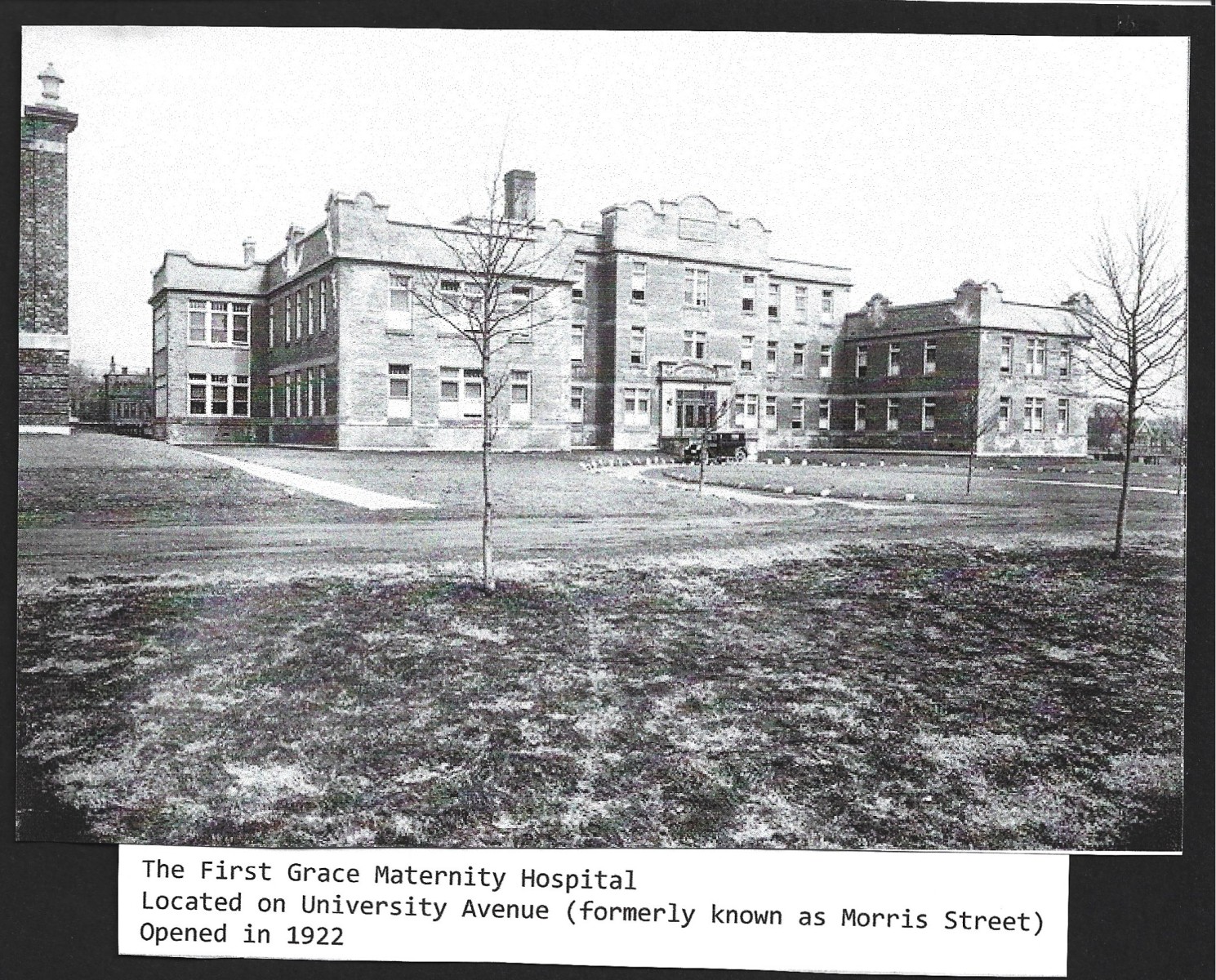 The Grace Maternity Hospital opened in April 1922, on the corner of Morris and Summer Streets for indigent maternity cases. The hospital was operated by the Salvation Army and it had a highly trained group of doctors for its public and consultation services, with general practitioners using the hospital and consultation services. The hospital began with ten qualified nurses on staff, with seven affiliated nurses involved in a three month internship and eight nurses taking the full maternity program of eighteen months durations; this hospital also provided a special nursery for infants.