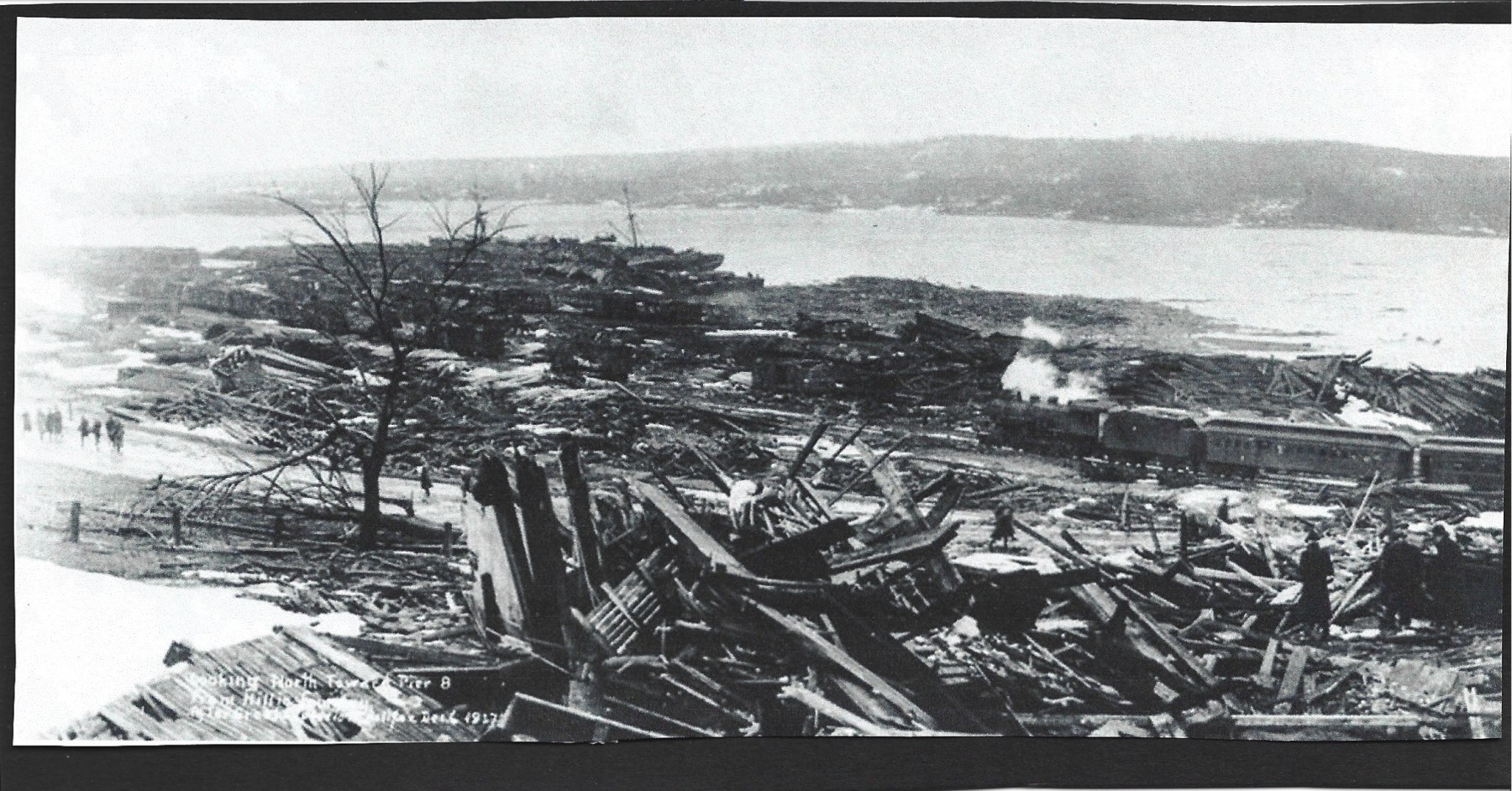On the morning of the disaster the night express from St. John, New Brunswick known officially as No. 10 Train, was nearing Halifax. It was made up of engine, postal car, baggage car, a second-class and a first-class coach and two pullman cars. Conductor J.C. Gillespie was in charge of the train. At Bedford it was ten minutes late and therefore did not reach Halifax in time to share the destruction which overtook the North End. Indeed, this particular train never reached Halifax at all. It was approaching Rockingham when the shock of the Explosion struck it. The cars were tilted violently over on the trucks as far as safety-chains would permit and then clashed back into their usual position. The glass broke gently all along the train, coming inside but injuring none of the passengers. The engineer was thrown against the boiler-head and badly hurt, but he struck to his post as engineers do and stopped the train. No one knew what had happened. A Canadian officer, lately returned from France described his impression, “It was as if a torpedo had struck the train”. After waiting about fifteen minutes, the train proceeded to Rockingham and then crept up to Willow Park Junction, to a point between the black settlement called Africville and the wrecked district of Richmond, just before the streets of Halifax proper begin.