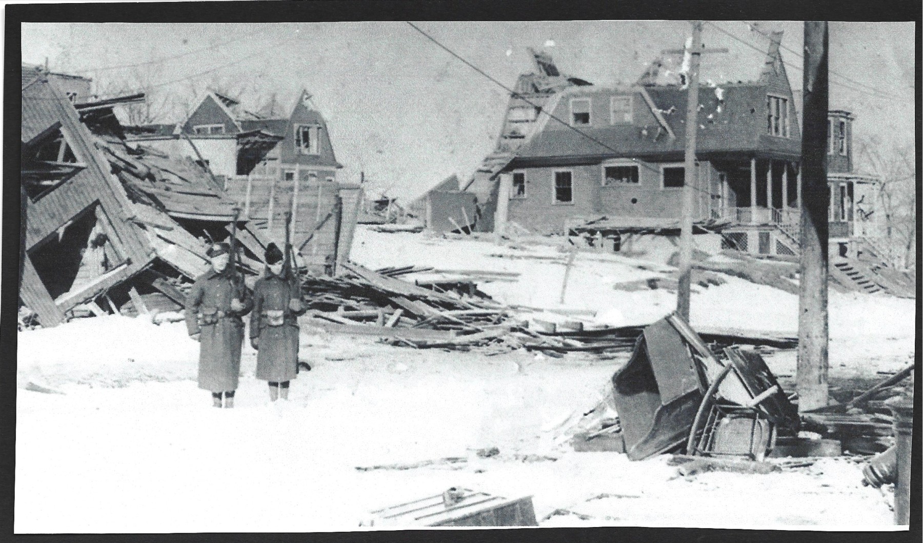 Very soon after the train came to a standstill, men in uniform began to come upon the scene one at a time. Some had bandages on their heads or arms, some were maimed, with one arm or one leg, a number were dressed ‘improperly’, as the army phrase runs. These were undoubtedly hospital patients who had been dismissed from Rockhead Prison that morning when the injured poured in for treatment, others had come from the hospital at Pier 2. There were some fifty in all. On the train that morning was Col. E. C. Phinney, who had been in command of the 85th Battalion, C.E.F. in France. He was in uniform and quickly organized these soldiers into working parties and pursued the work of rescue as systematically as possible. They ascertained as well as they could, if anyone was alive in a house. If there was no one, they let it burn and went on to the next. These men, collected by chance, worked remarkably well together and showed the results of the discipline they had undergone and their familiarity with danger and death. The rumour of the second explosion reached these workers in the mysterious way that rumour is communicated, for they were not officially warned. Col. Phinney pointed out to them that there was no likelihood of avoiding danger by leaving their task. The best thing to do was to ‘stick it’. Their response was ‘sure’ and the informant added, ‘they went to it’. That morning at least forty, possibly as many as sixty persons were rescued from the burning houses. They were chiefly babies, small children and old people.