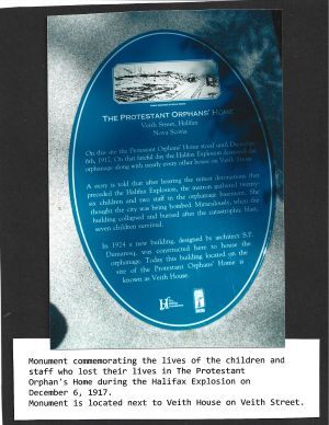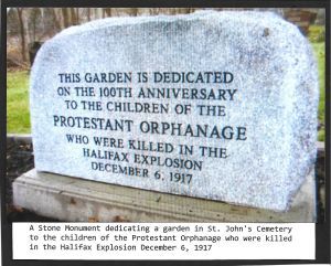 The Home caught fire during the Explosion and burned down with a great loss of life. The Protestant Orphanage children and staff that died are buried in St. John’s Cemetery. The size of the plot is 20×27, has a small headstone and a monument which is hard to read but says, “IN MEMORY OF THE CHILDREN AND STAFF OF THE PROTESTANT ORPHANAGE KILLED IN THE HALIFAX EXPLOSION DECEMBER 6, 1917”. Next to this is another monument which stands in a garden box, it was placed there on the 100th anniversary of the Explosion to commemorate the children of the Protestant Orphanage who were killed in the Explosion.
