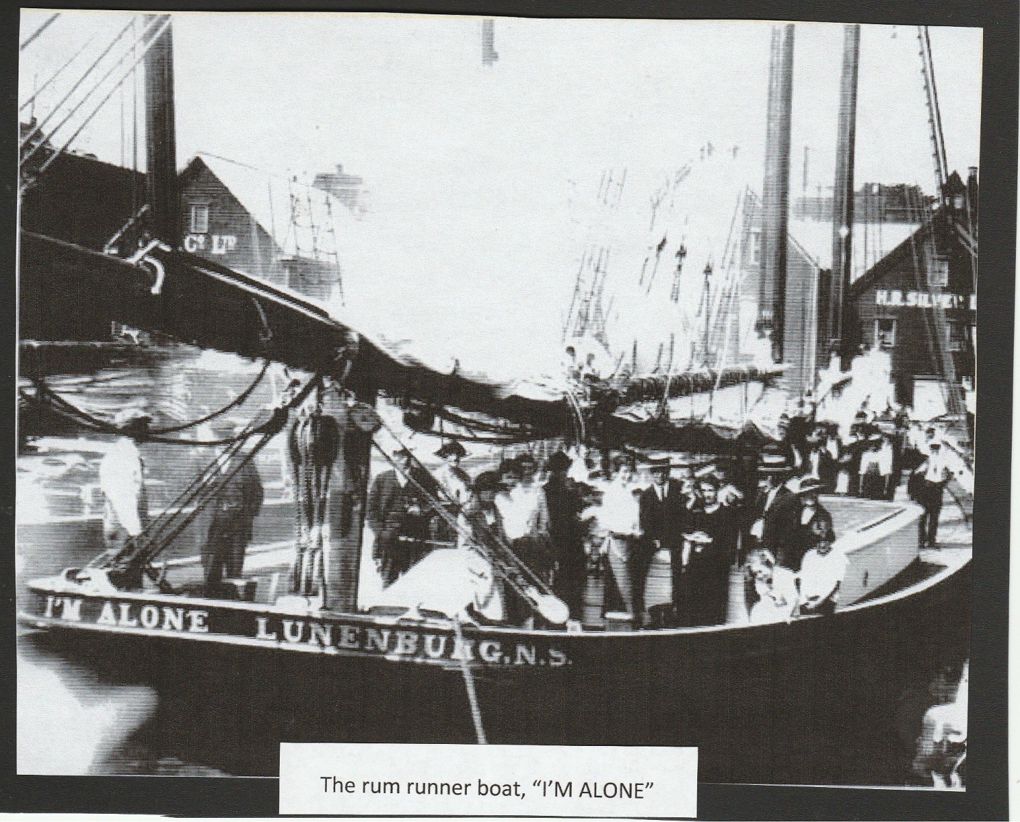 The schooner was sold in Lunenburg, Nova Scotia in September 1928 by Jamie Clark who was representing two New York bootleggers. Thomas Randall, a Newfoundlander, was hired to be the Captain. In March 1929 when, at the end of a rum running trip to Louisiana, the schooner was chased by the cutter “Walcott” and Captain Randall was ordered to stop which he ignored. Randall continued to head for a destination off the Mexican coast. Another cutter called the “Dexter” now was chasing the rum runner and when Randall continued to disobey orders to stop, the Dexter opened fire and sent 20 rounds through the rigging, sails and hull of the Schooner.