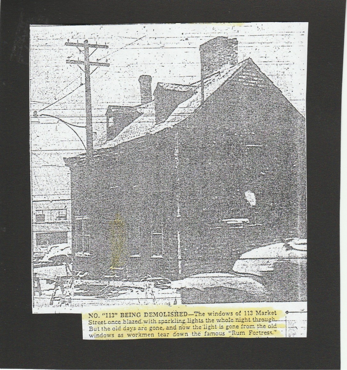 In 1952, an “Old Rum Fortress” at 113 Market Street was condemned and ordered to be demolished by the City Health officials. The old house had metal-lined walls and metal sheathed hatches and shutters, metal-buttressed doorways and even the stairways were lined with metal. All the metal in the house kept the police at bay but sure posed quite a demolition problem for the wrecking crews.