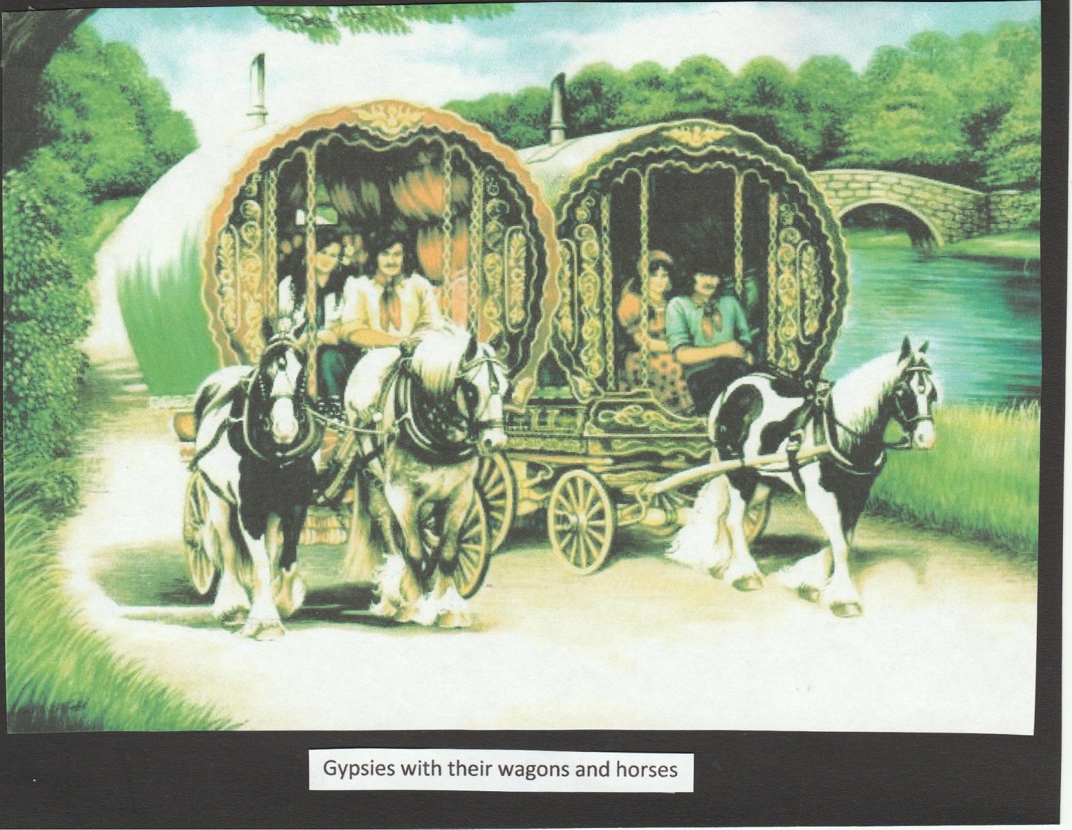 Many knew the Romani people as “Gypsies” but they preferred to call themselves “The Roma.” Romani people originated from Northern India. Years ago they camped in tents and wagons travelling in caravans with their horse and wagon, wandering from place to place having no fixed address.