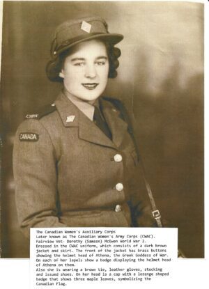 The first Armed Service to open its doors to women (other than the Nursing Sisters) was the Air Force. In July 1941 ‘The Canadian Women’s Auxiliary Air Force’ (CWAAF) was founded. The following spring it was renamed the ‘Royal Canadian Air Force’ (Women’s Division) referred to as the WD. While the women were not permitted to serve as pilots, over 17,000 women joined during World War 2 in jobs ranging from clerical duties, to drivers, airframe maintenance, air traffic control, weather observers, wireless operators, and parachute riggers, as well as many other jobs. They were disbanded on Dec. 11, 1946.