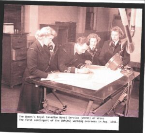 The last service to permit women to join was the Navy. The Women’s Royal Canadian Naval Service (WRCNS) or ‘Wrens’ as they became known, was formed in July 1942. Women played a larger role in the Second World War than in the first and about a thousand Wrens were stationed at Stadacona during the Second World War, but were not allowed in the ‘wet’ (serving beer) canteen at Stadacona. The Wrens worked as land or marine radio operators, coders, transport drivers, and also as secretaries. Over 6,000 Wrens served in World War 2 by the end of the war, 500 Wrens had served overseas in London, Londonderry, Greenock, Glasgow, and Plymouth. Another 500 served in Newfoundland (at the time was an overseas location) and in Washington, DC.